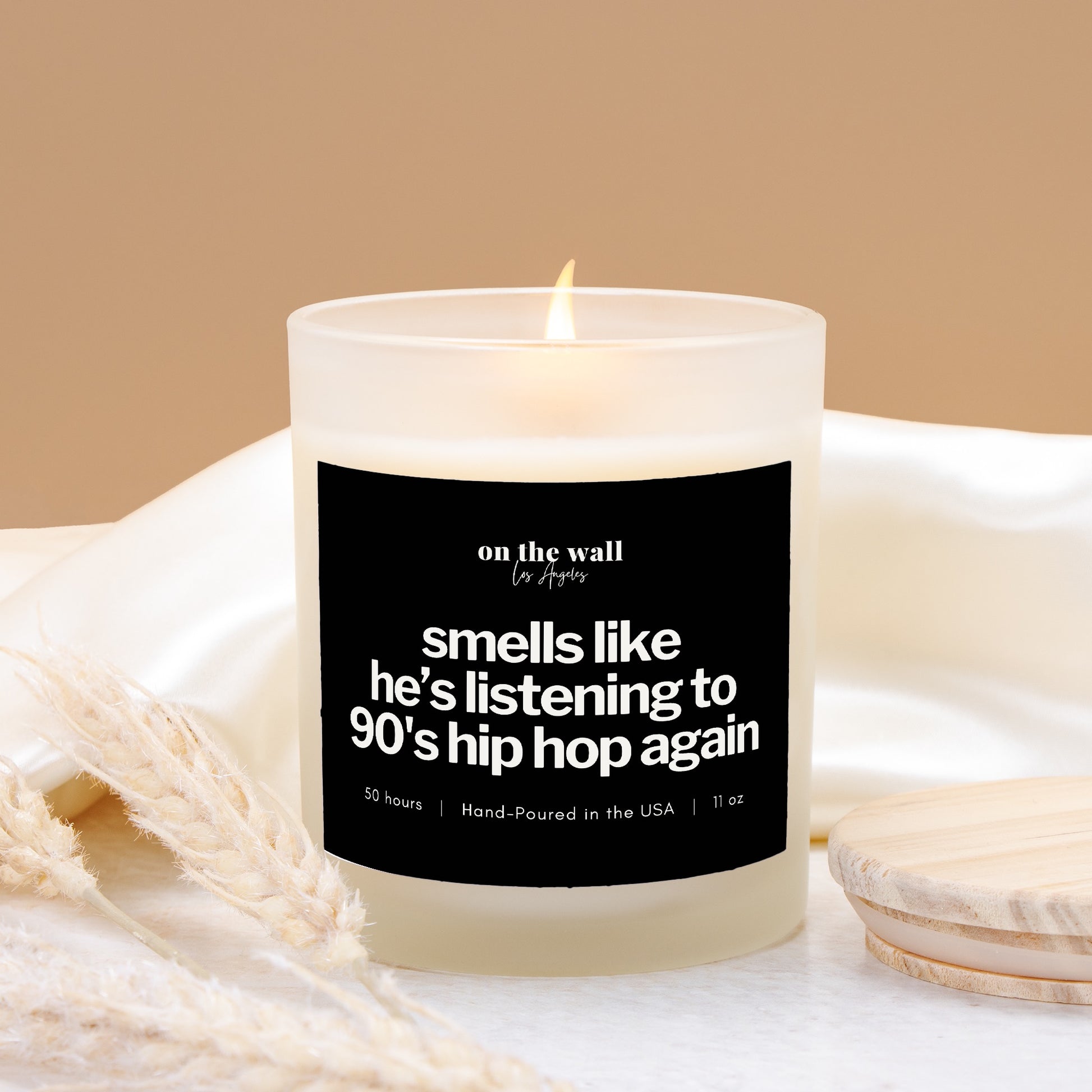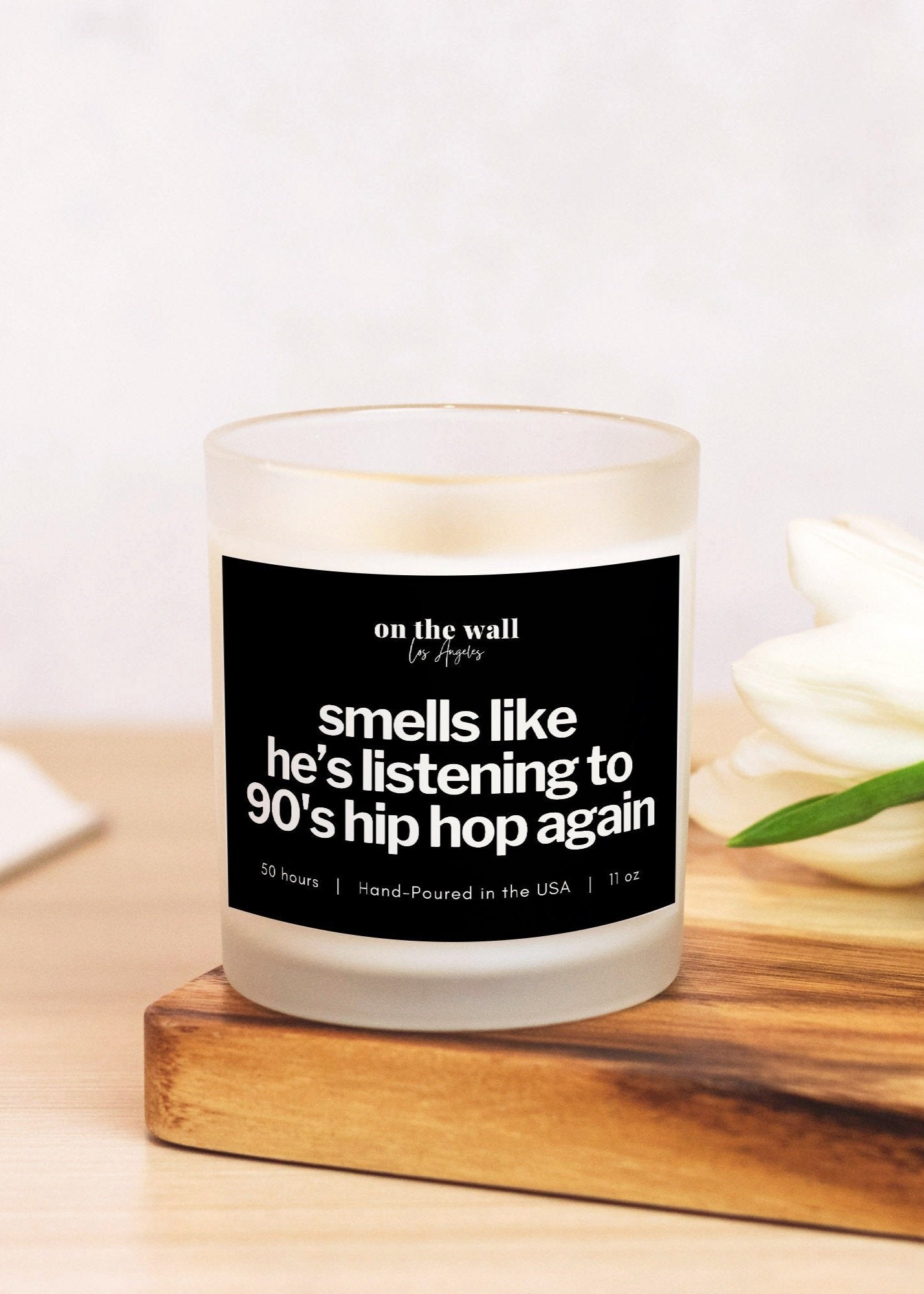 Step back into the golden era of 90's hip hop with our enchanting 11 oz frosted glass candle, playfully labeled "smells like he's listening to 90's hip hop again." This unique candle is the perfect gift for hip hop lovers and captures the essence of nostalgia, combining the warmth of memories with the coziness of home.