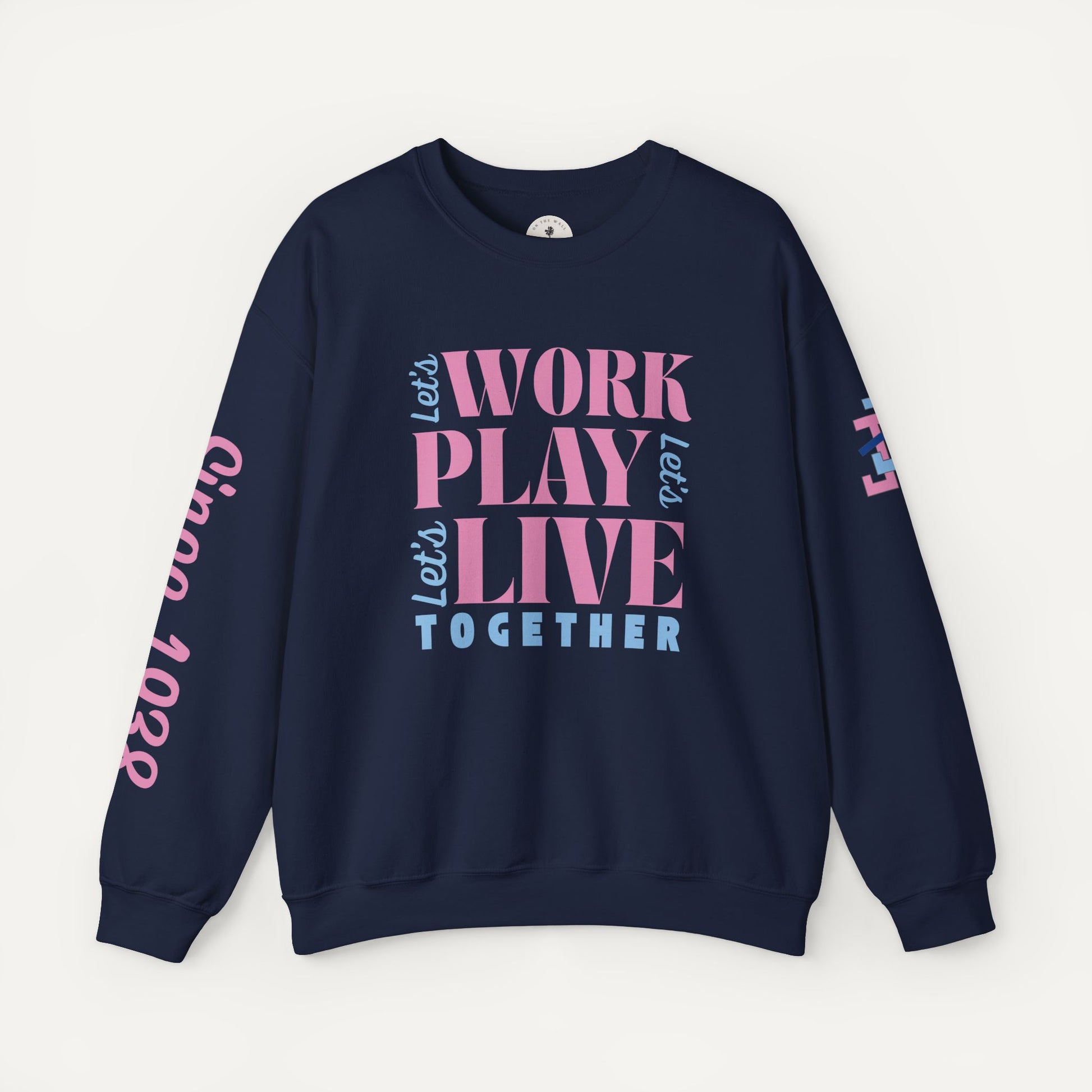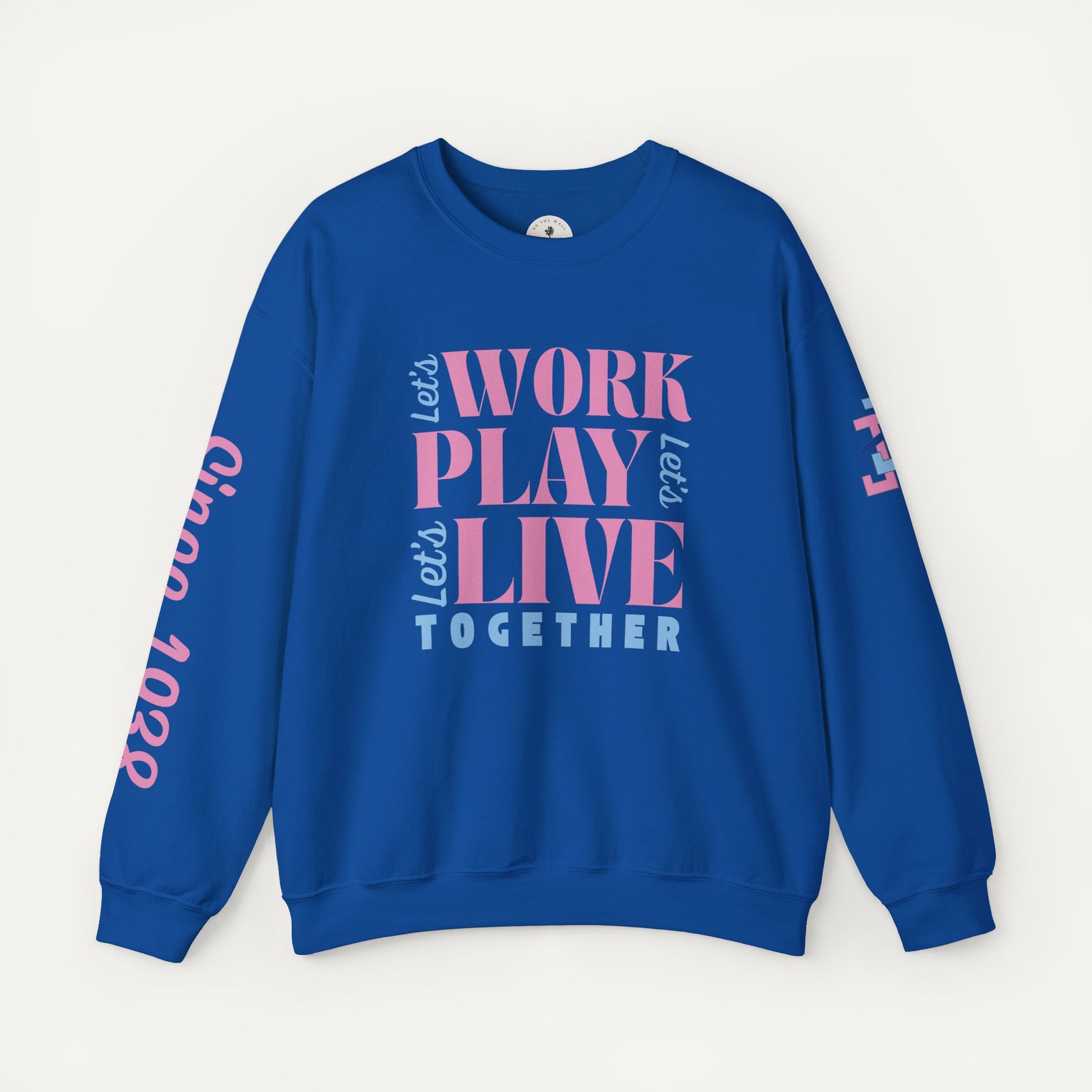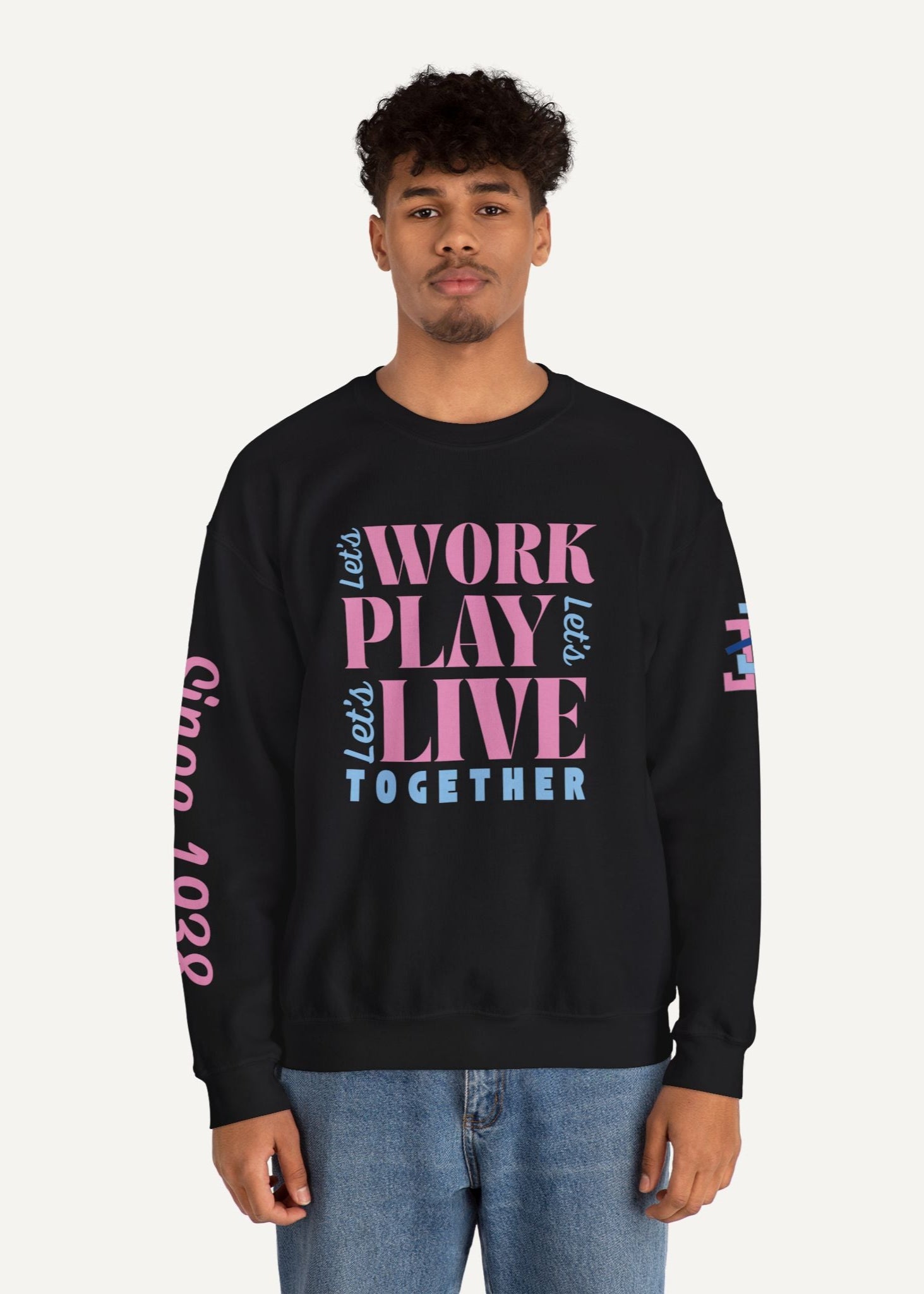 Show your pride in style with our Work Live Play Unisex Sweatshirt, inspired by the timeless Jack and Jill of America motto: "Let’s work, let’s play, let’s live together." The motto is boldly displayed on the front, making a meaningful statement about unity and purpose.
